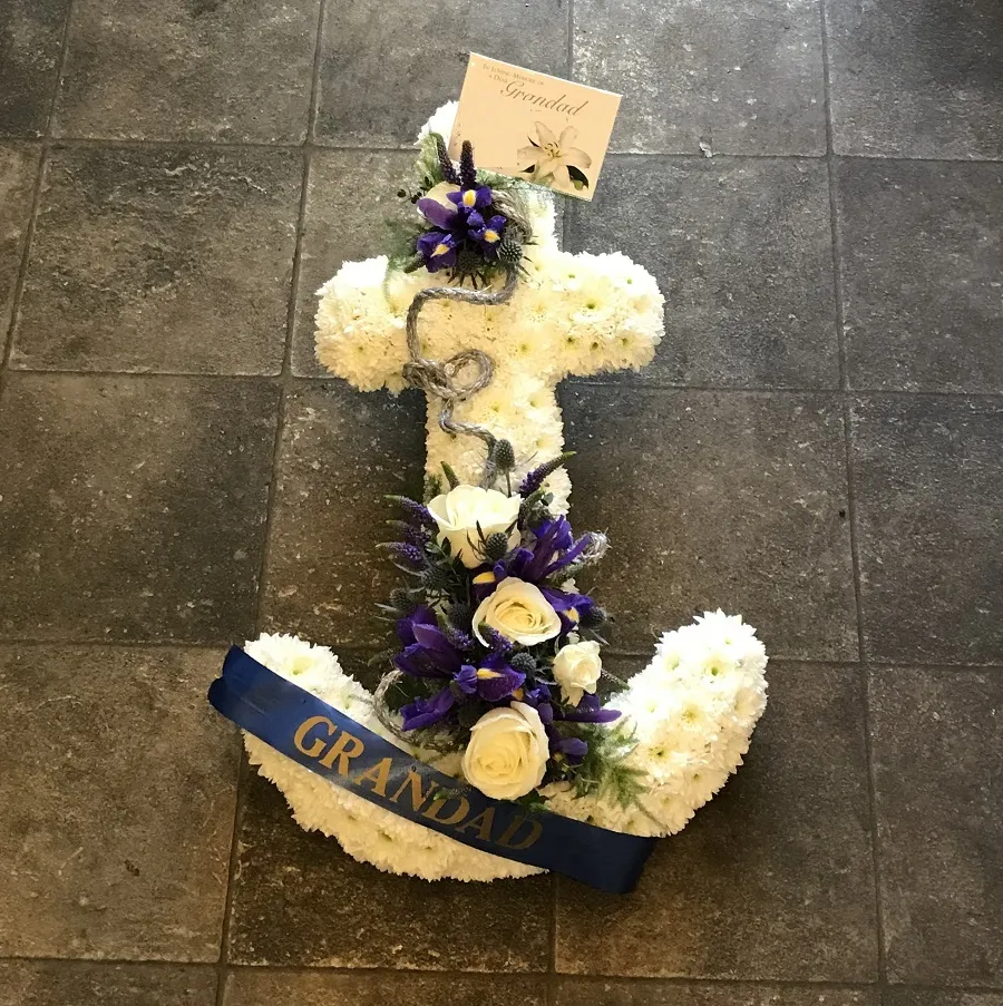 An anchor shaped design using a mass of white double spray chrysanthemums with a feature spray of red short stemmed roses and a contrasting blue eryngium. The tribute is finished with green foliage and a silver cord.
