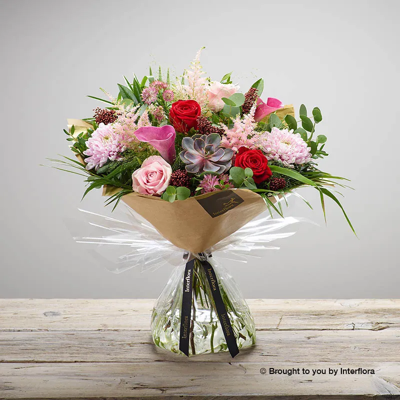Featuring pink calla lilies, red and pink large headed roses, a pink echevaria, pink bloom chrysathemums, pink astrantia and pink astilbe, hand-tied with eucalyptus, palm, panicum grass, pistache and burgundy skimmia, and presented in Gift Packaging.