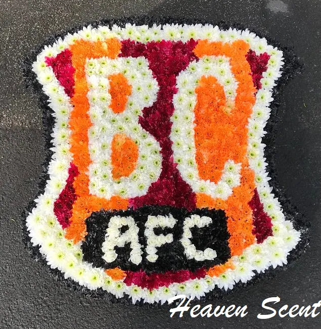 A mass of Double Spray Chrysanthemums are used to create this Bradford City Funeral Tribute