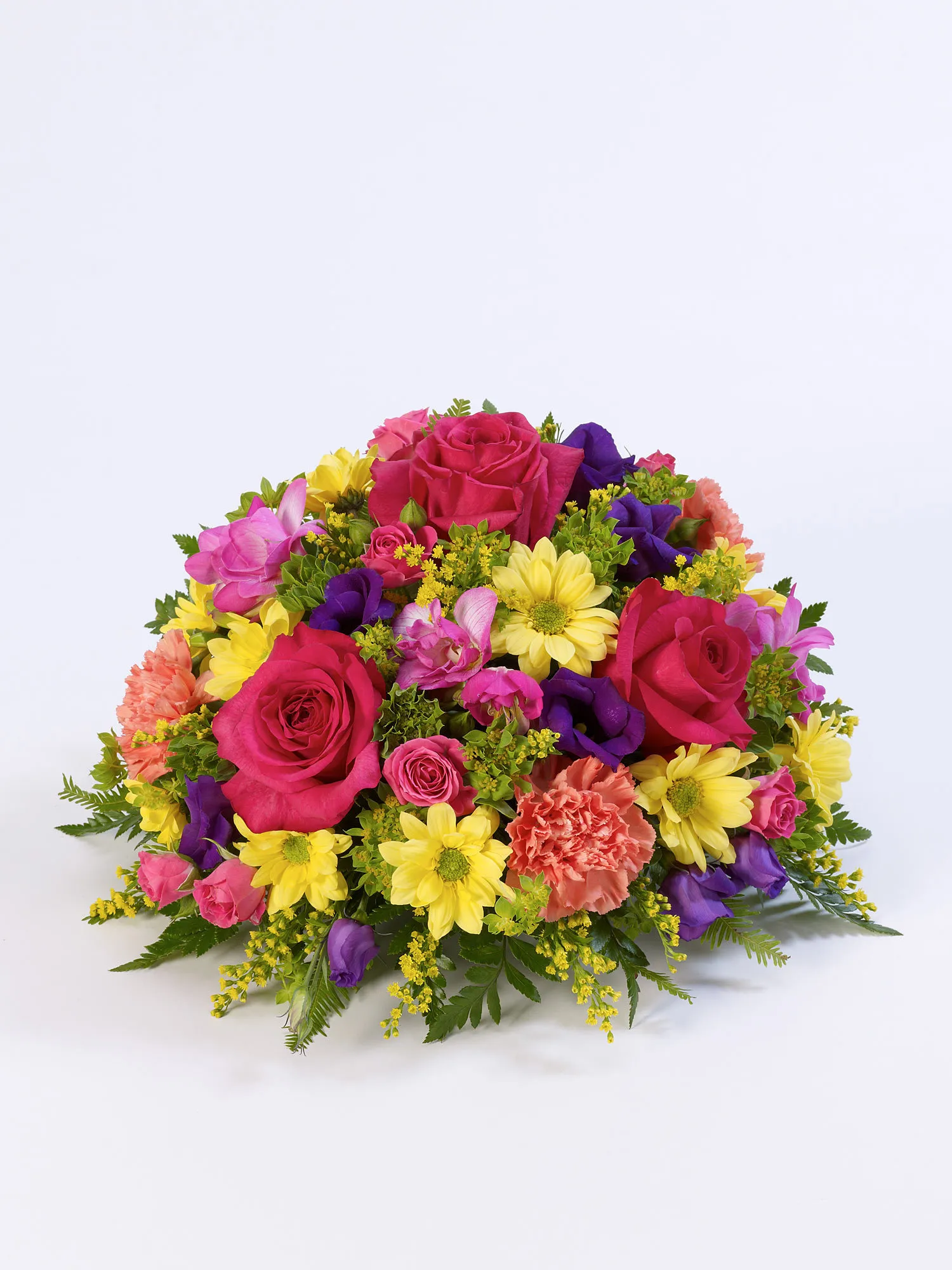 A classic selection including large-headed roses, freesias, lisianthus and spray chrysanthemums presented in a posy design.