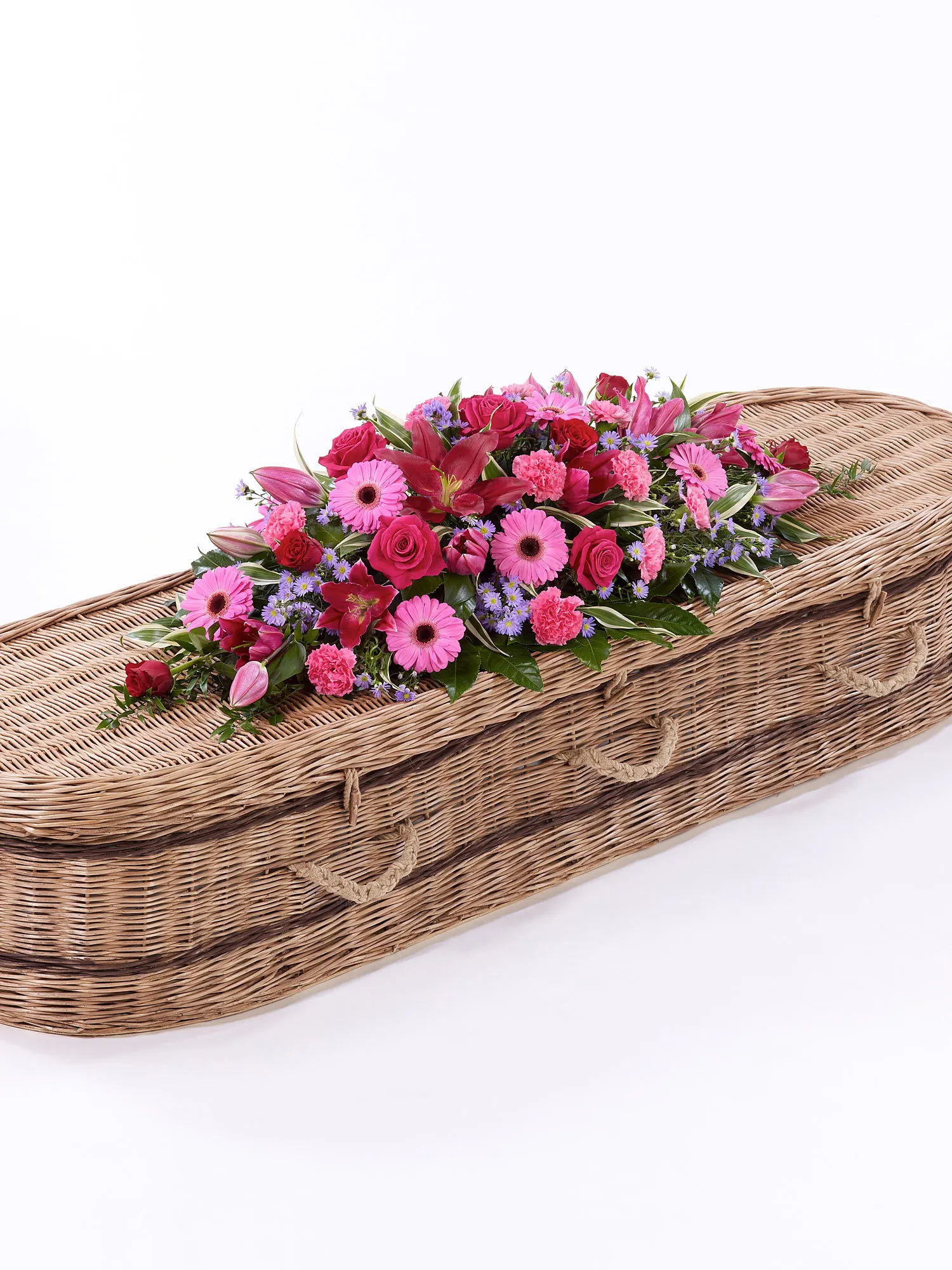 This bright casket spray feautring a classic selection of flowers in pink, red and lilac includes large-headed roses, carnations, gerberas and Oriental lilies complemented by luxurious foliages.