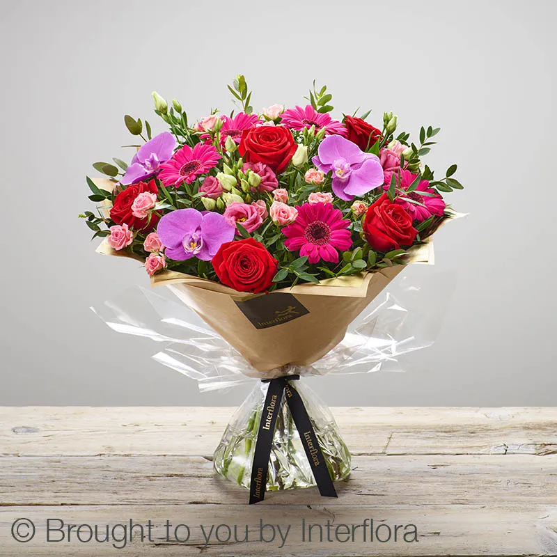 Featuring pink phalaenopsis orchids, red large headed roses, pink spray roses, pink lisianthus and cerise germini, hand-tied with eucalyptus and pistache, and presented in Interflora Gift Packaging.