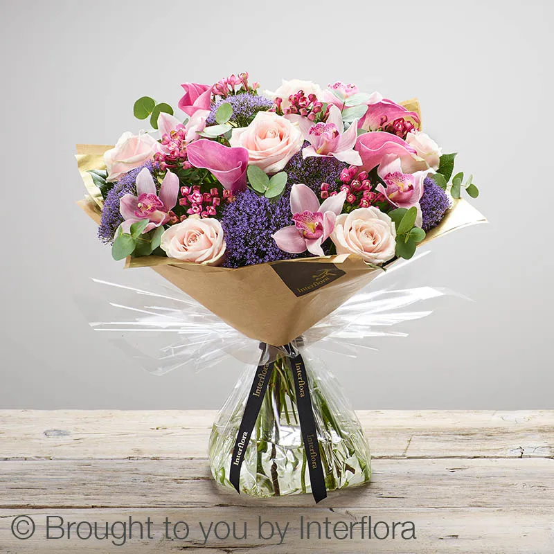 Featuring pink calla lilies, pink cymbidium orchids, pale pink large headed roses, lilac trachelium, cerise bouvardia with eucalyptus and salal, presented in Interflora Gift Packaging.