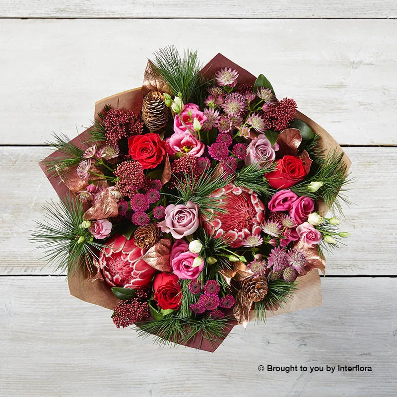 Featuring red large headed roses, pink astrantia, lilac large headed roses, burgundy skimmia, purple chrysanthemums, pink lisianthus and pink protea, with copper salal, pine and spruce cones, hand-tied, wrapped and presented in Interflora gift packaging.
