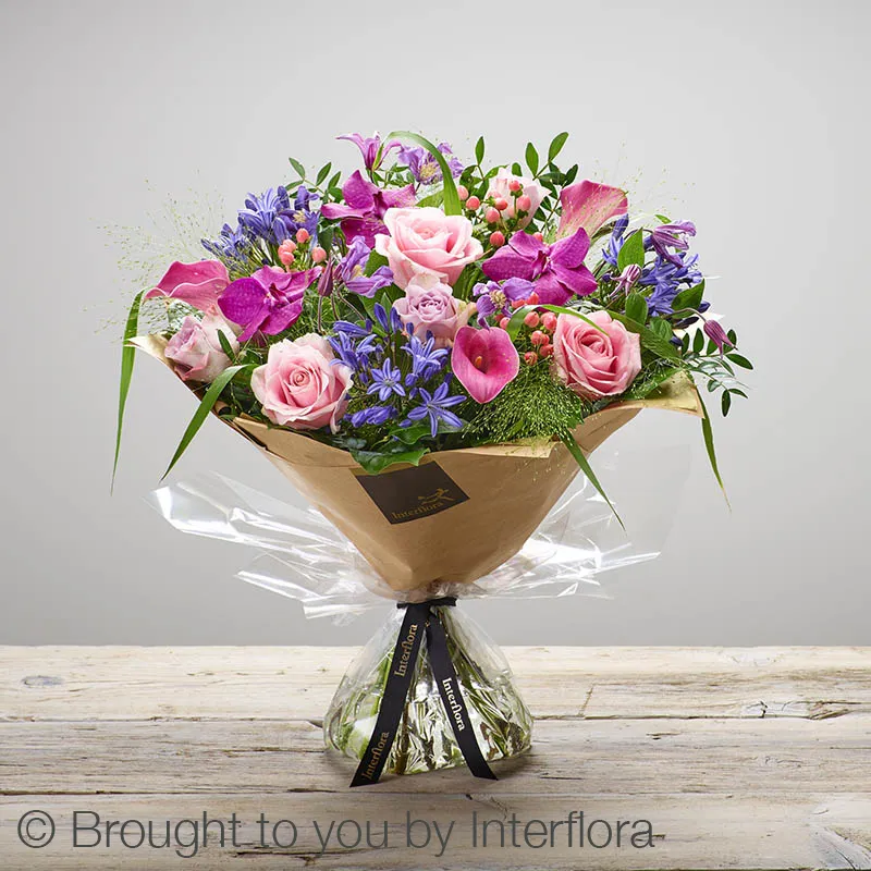 Featuring blue agapanthus, pink calla lilies, purple clematis, peach hypericum, pink and lilac large headed roses and cerise vanda orchids, hand-tied with panicum grass, pistache and salal, and presented in Interflora Gift Packaging.