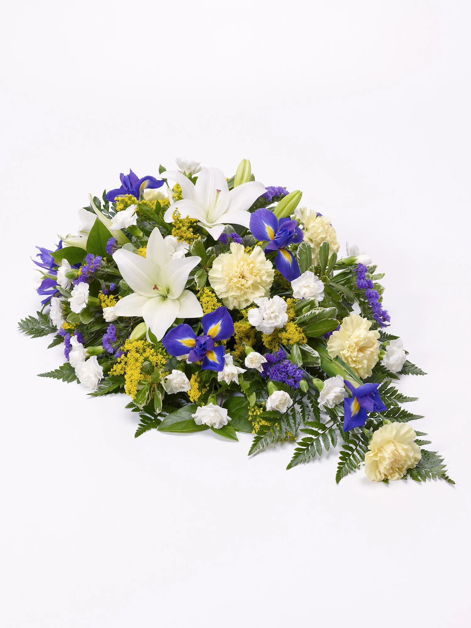 Asiatic lilies and carnations are presented with irises, spray carnations and choice foliage to create this lemon and blue teardrop spray.