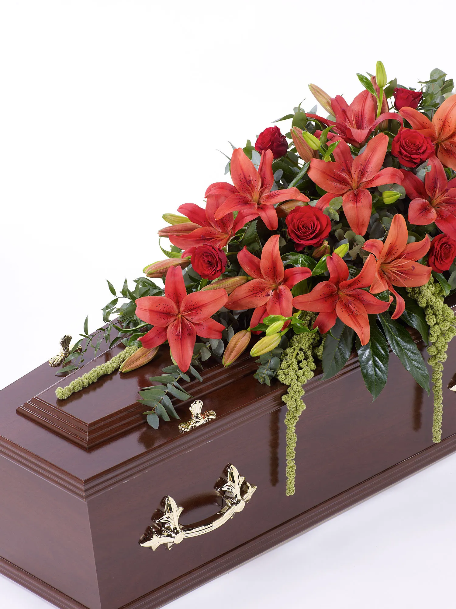 This striking casket display features a selection of fresh Asiatic lilies and large-headed roses. The flowers are carefully arranged with amaranthus, ruscus, eucalyptus and aralia leaves.