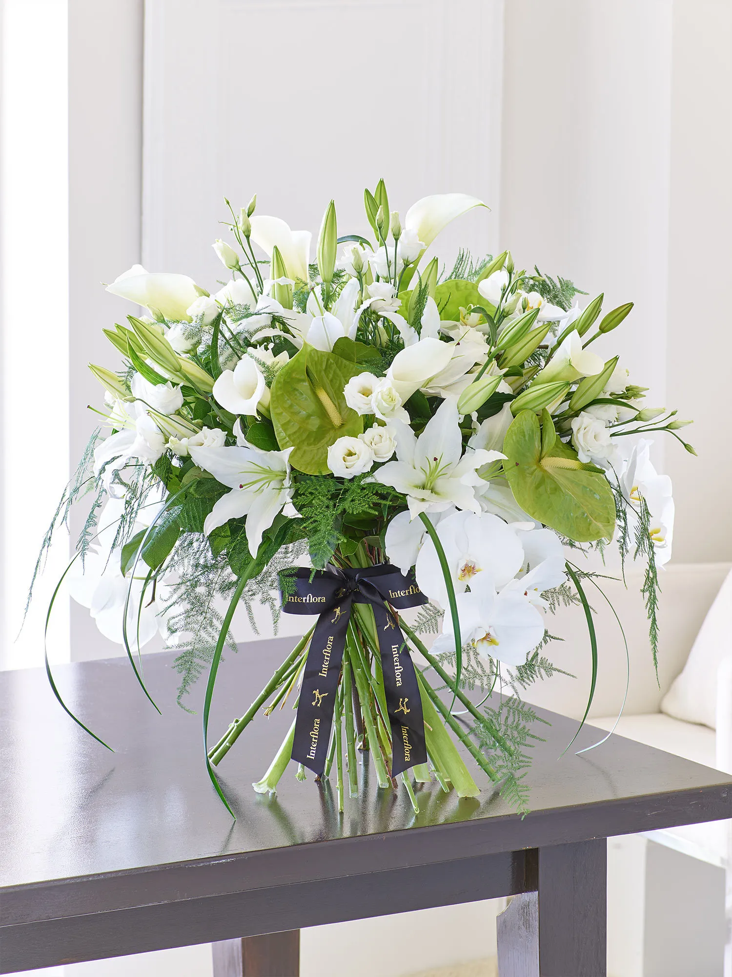 Featuring 3 White Sensation Phalaenopsis orchid, green Midori anthurium, white Avalanche calla lilies, white Rosita double lisianthus and white Helvetia Oriental lilies with asparagus fern, Lily grass and salal, expertly hand-tied and presented in luxurious packaging for maximum impact when your gift is delivered
