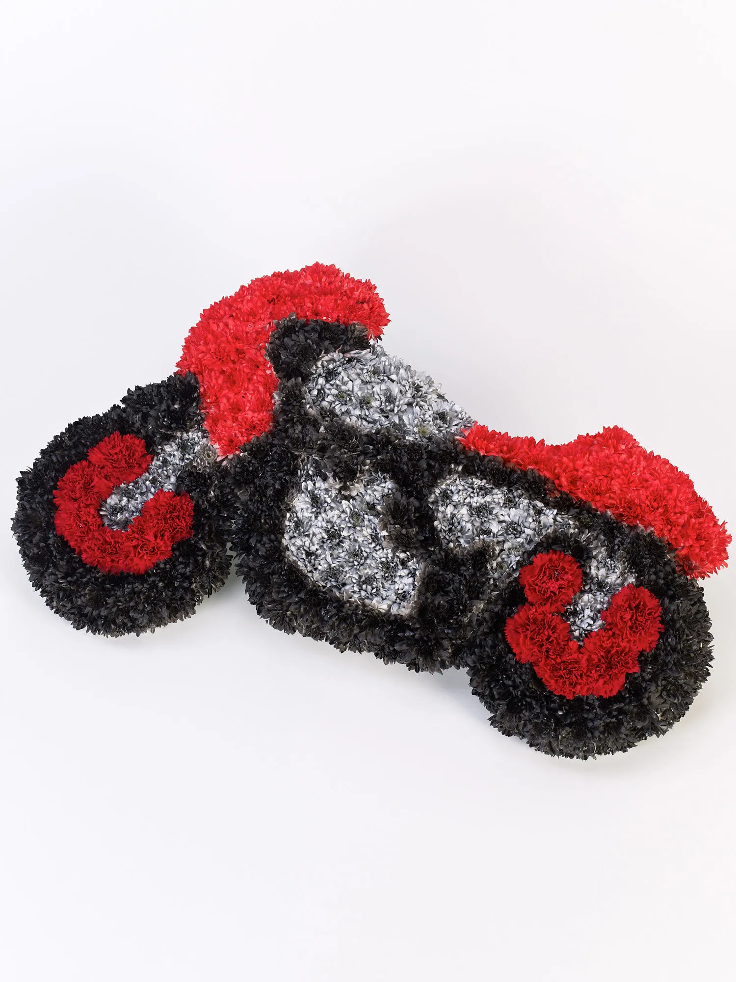 Pay tribute to their love of motorcycles with this distinctive floral display. The motorbike is covered in a bed of fresh red carnations and white double spray chrysanthemums and finished with silver, red and black spray colours.