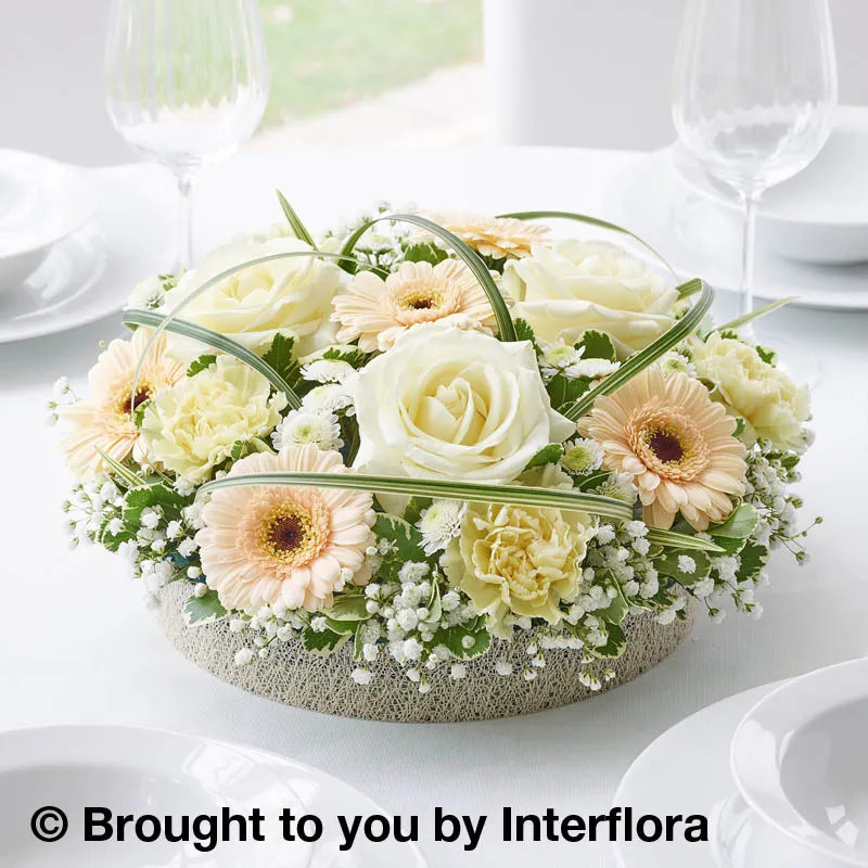 Harmonious tones of honey, pale peach and soft white combine in this pretty, cushion-shaped table centre.