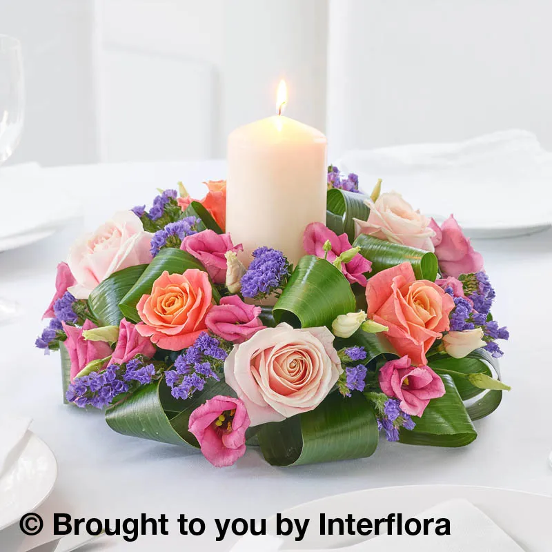 The complementary and contrasting colours in this enchanting arrangement are a delight. Peach, fuchsia, pale pink and violet tones co-ordinate beautifully to create a fresh and modern centrepiece.