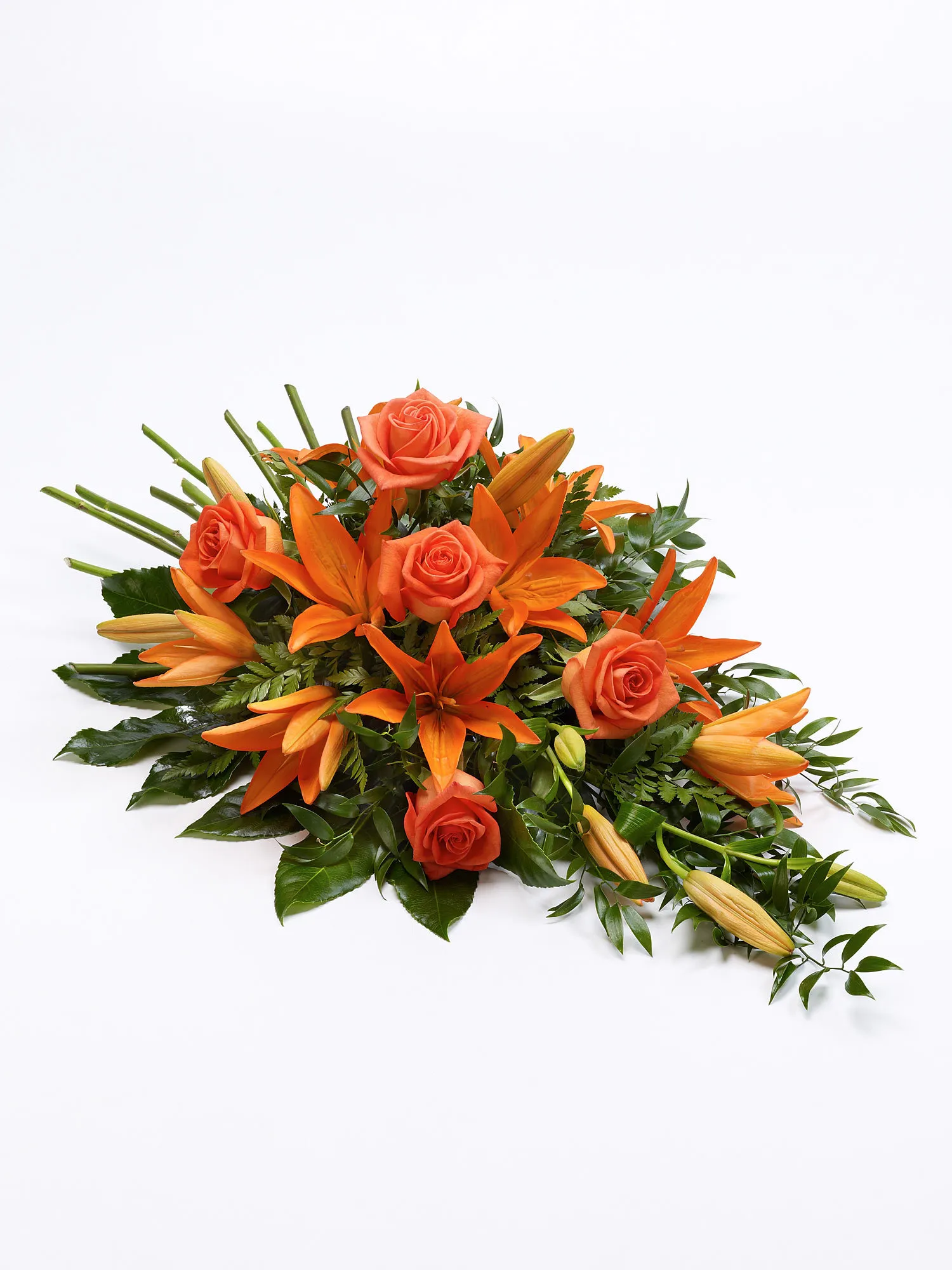 Aralia leaves and French ruscus are nestled amongst classic Oriental lilies and large-headed roses in this classic teardrop spray.