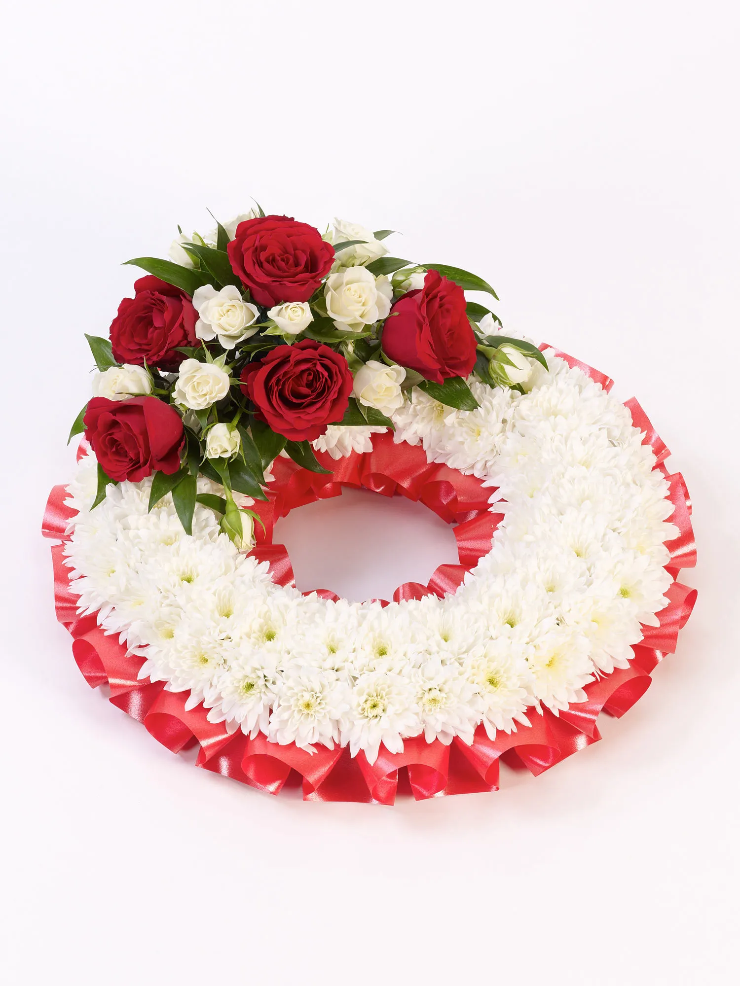 A classic circular wreath covered with a mass of white double spray chrysanthemums and finished with a red and white spray of roses and spray roses and finished with a red ribbon trim.