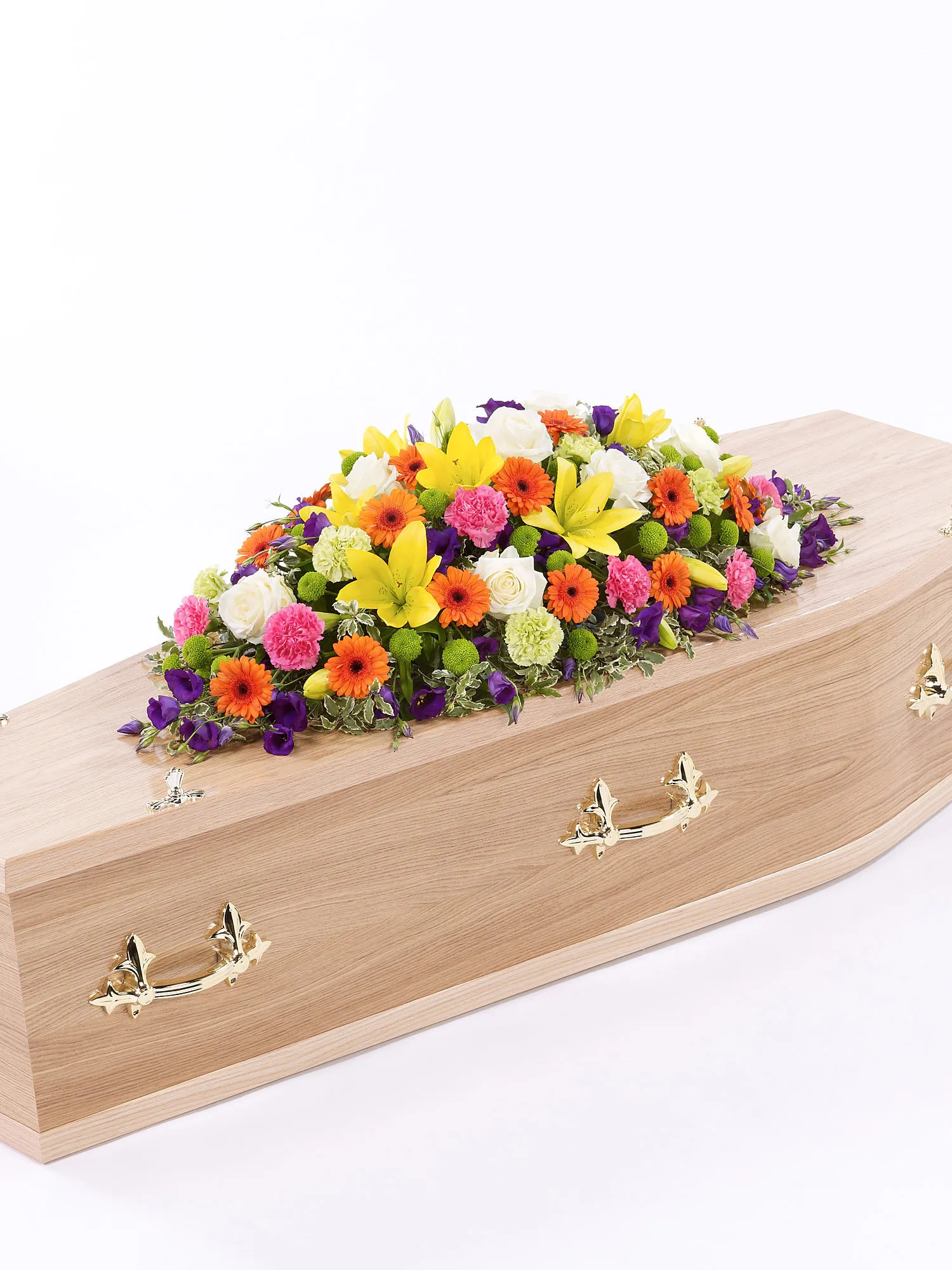 We’ve selected fresh flowers in bright shades of hot pink, golden yellow, bright orange, lime green and rich purple. These naturally vibrant colours work beautifully together to create a stunning casket spray of lilies, roses, lisianthus, carnations, germini and chrysanthemums.
